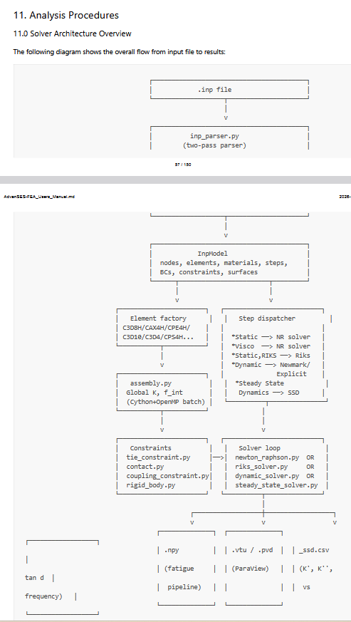 A two-pass .inp parser builds a full Inp Model of nodes, elements, materials, BCs, constraints, and surfaces, before anything is solved. Element support spans C3D8H, CAX4H, CPE4H, C3D10, C3D4, and CPS4H families. Global stiffness K and internal force f_int are assembled in Cython-accelerated, OpenMP-parallelized batches.
