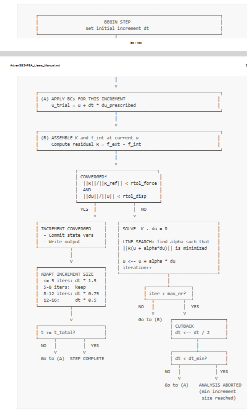 • >> Adaptive increment control: dt scales up (×1.5) for fast convergence, scales down (×0.75 or ×0.5) when iterations climb, and cuts back (dt/2) on non-convergence, with a hard floor dt_min before aborting